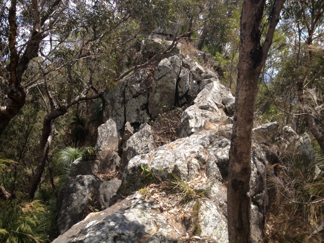 At the top of the short flat areas we often looked down on something different, a sheer cliff face here, a long rock gully there or down on top of a mini forest. Each time we’d scramble up to the top of a ridge we’d find the great spire of the next one staring down at us. This gave the sense that the mountain just keeps going, on and on. But eventually we climbed over a ridge to find we’d run out of mountain. The top of the Eastern Peak is an open rocky area giving us a total 360º view.