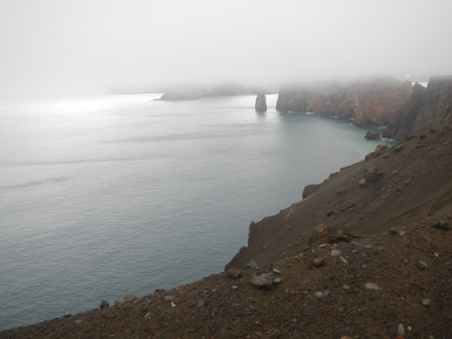 We sailed through and even with the low clouds it was picturesque. The bay inside was huge and we anchored in a smaller bay just inside called Whalers Bay. On reaching land, we set foot on black volcanic pebbles and sand. There were a number of old broken down buildings which we were warned not to enter because they were unstable.