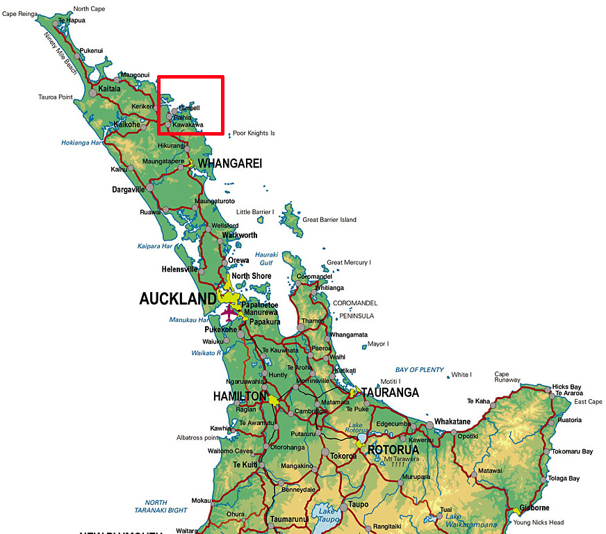 The Bay of Islands houses Russell, site of the first European settlement in New Zealand. And, at the eastern edge of the bay is the Cape Brett Peninsula, a forest covered area with a lighthouse at its tip. One of the islands just out from the end of the peninsula is also home to one of the region’s better known tourists spots, a natural arch of rock called the Hole in the Rock.