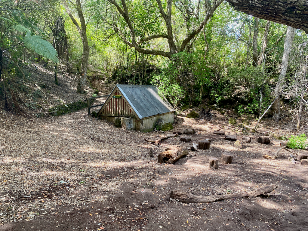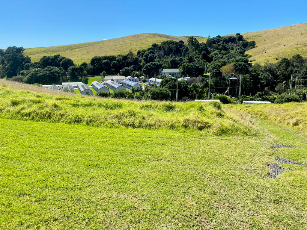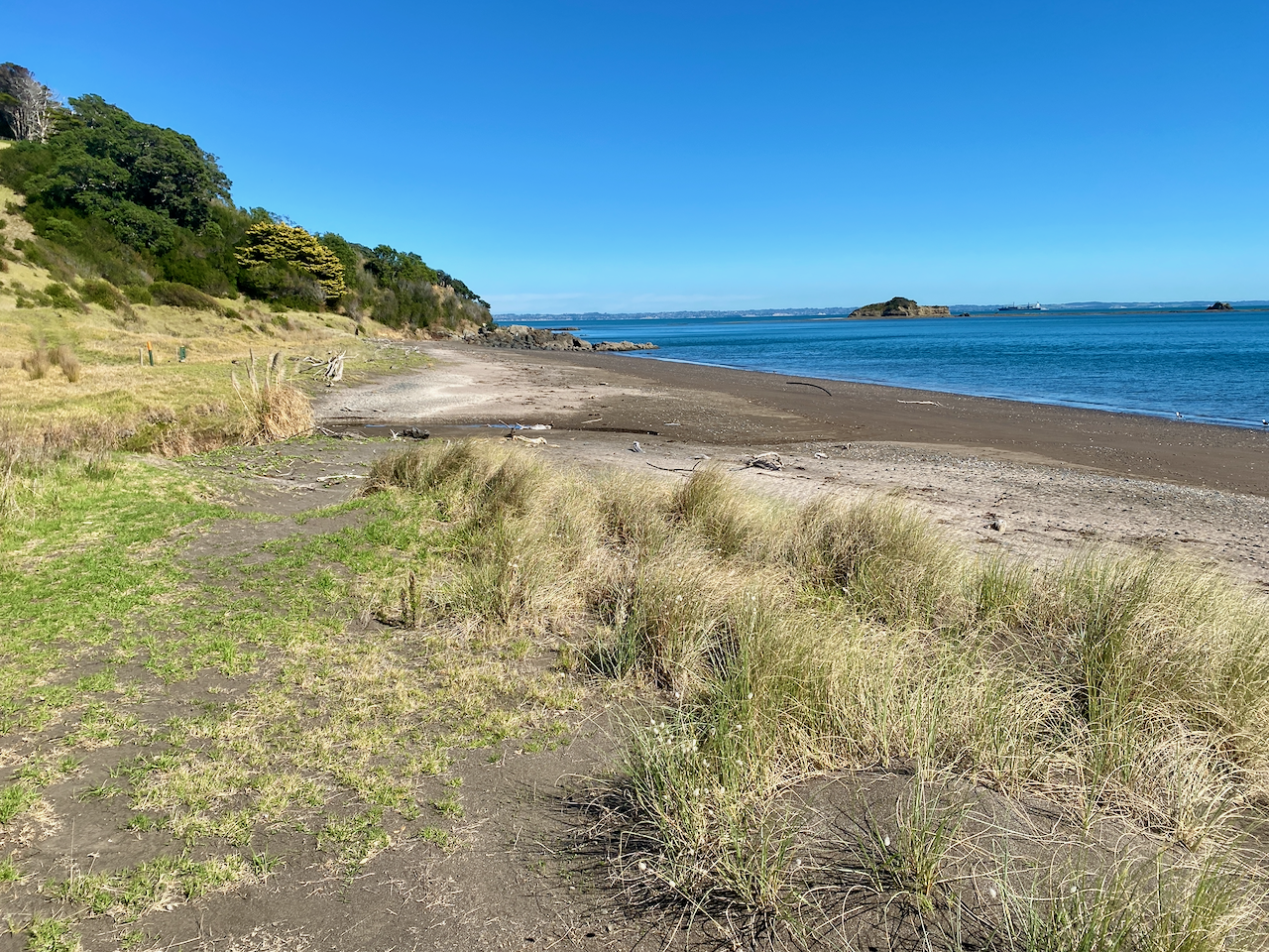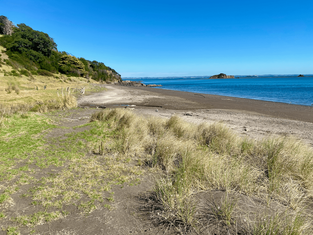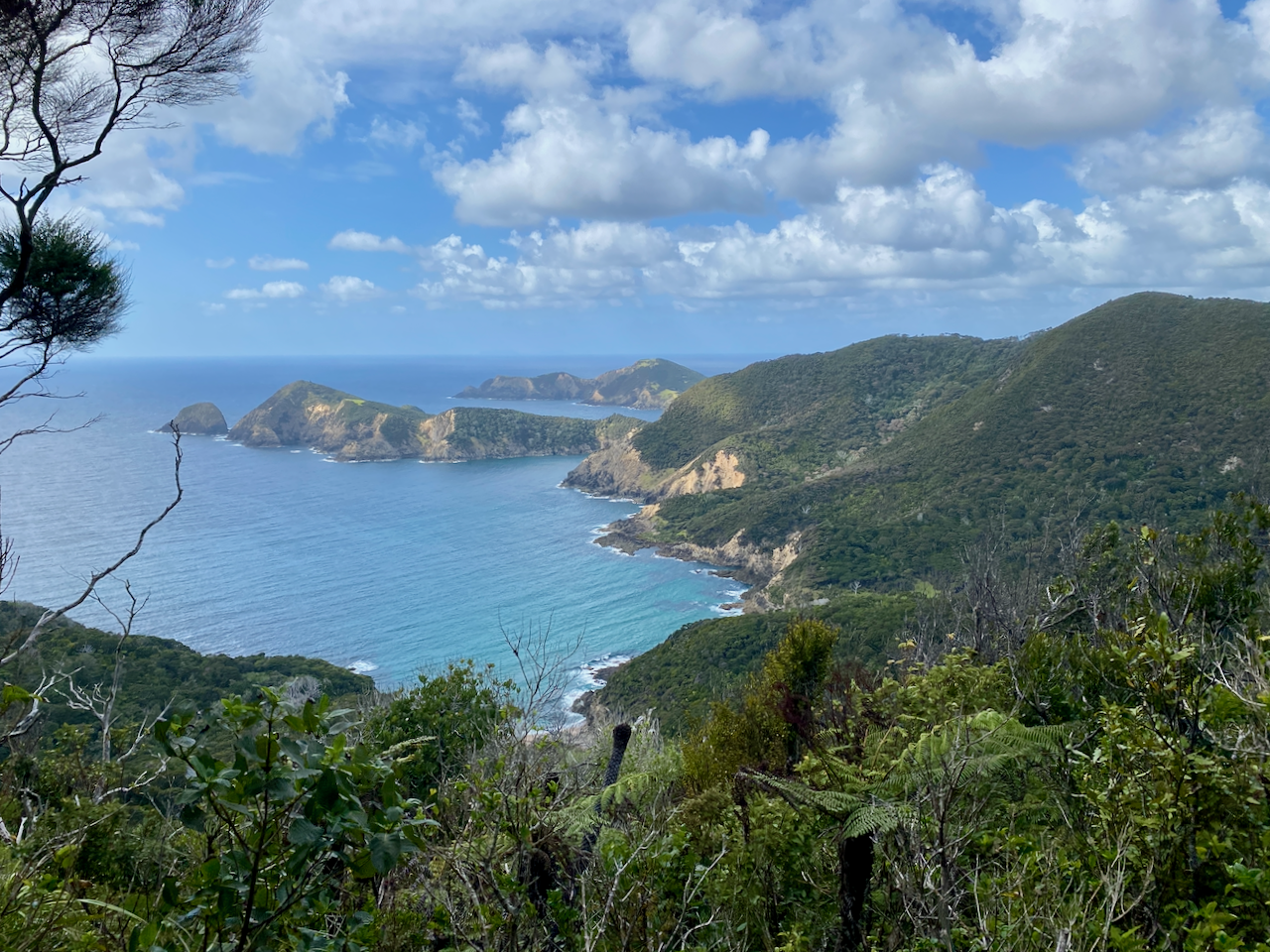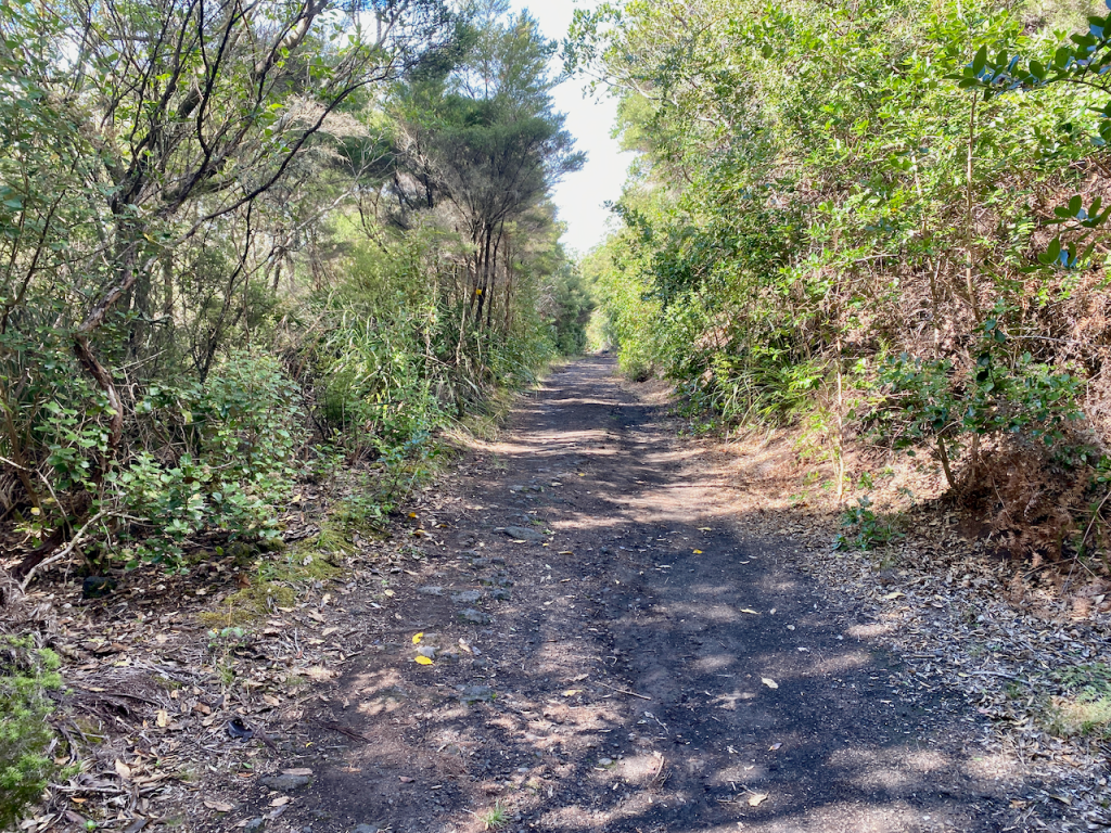 At the base of Pukehuia is another closed track, this one also leading to the remains of Whangamumu whaling station. Soon after, I reached the predator proof fence that crosses the entire peninsula. It’s an electrified fence that keeps the possums out, although the gate was open when I arrived, I closed it once I’d gone through. For my second climb of day, smaller than Pukehuia, and the second highest of the walk, with a pair of peaks which I called the nipples. As I climbed down the first of these nipples, I passed the other two people I would see on the trail, and continued on to the far side of the 2nd nipple, where there’s a shelter. I stopped in an open grassy areas nearby for lunch with Outu Bay below.