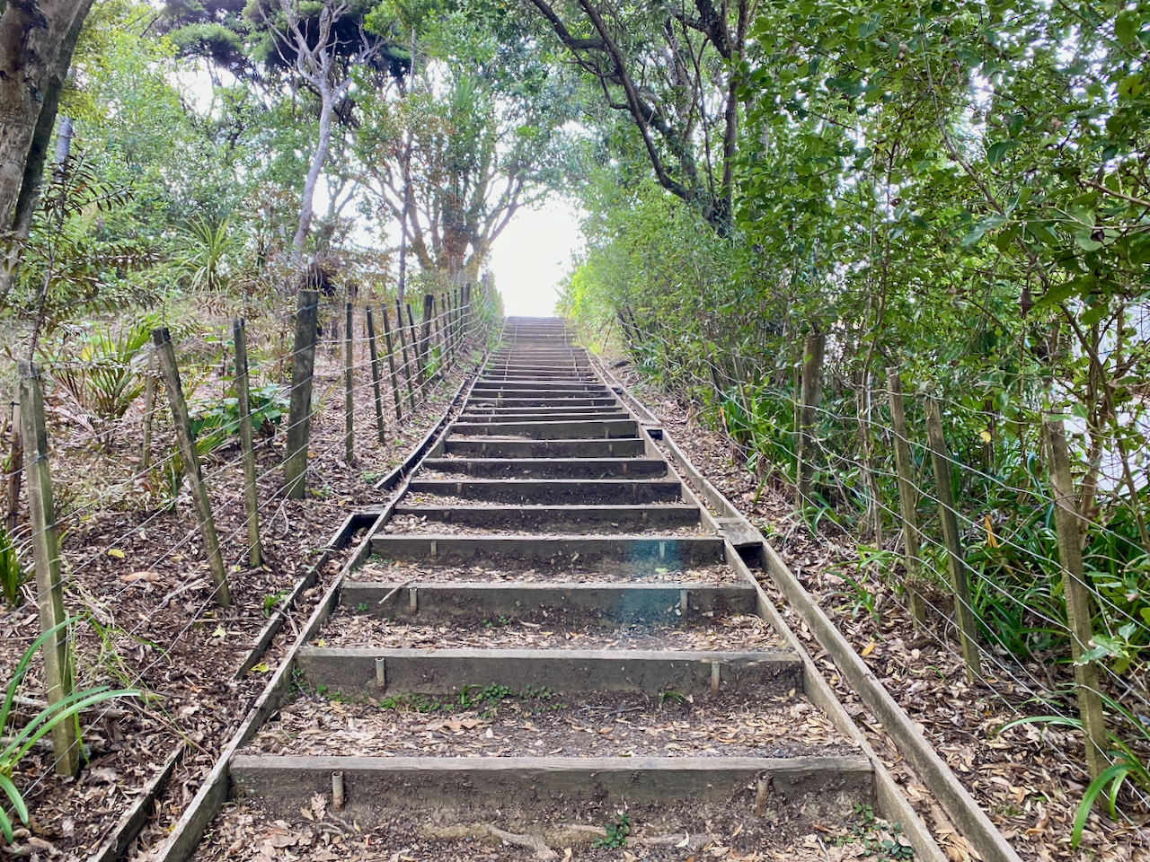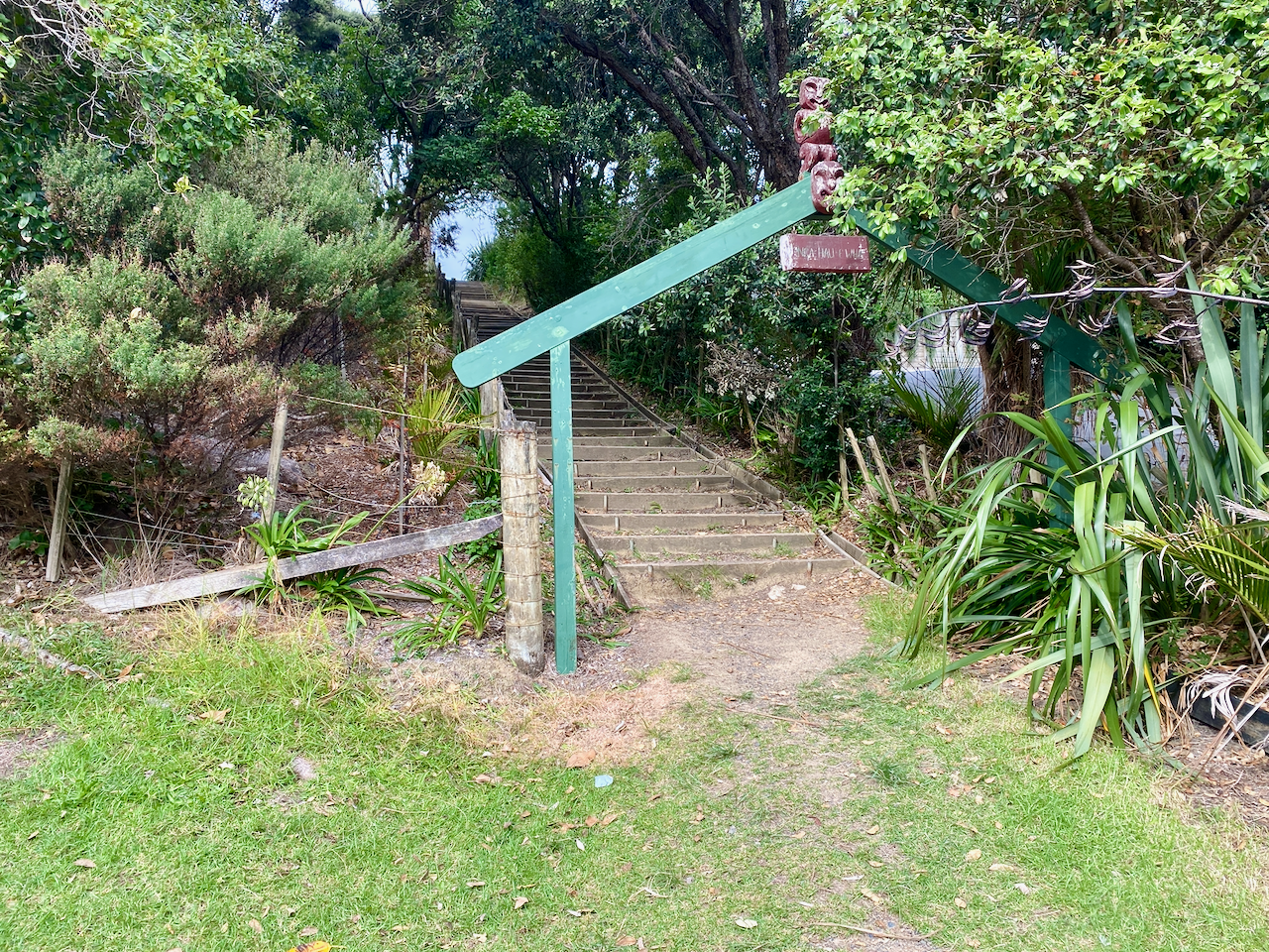 My backpackers is a kilometre from the trailhead of the Cape Brett Track, and my parking was included in the price, otherwise places charge NZ$10-20 for the night. I walked along the road past Kaingahoa Bay, to Hauai Bay, through the waharoa and up stairs.