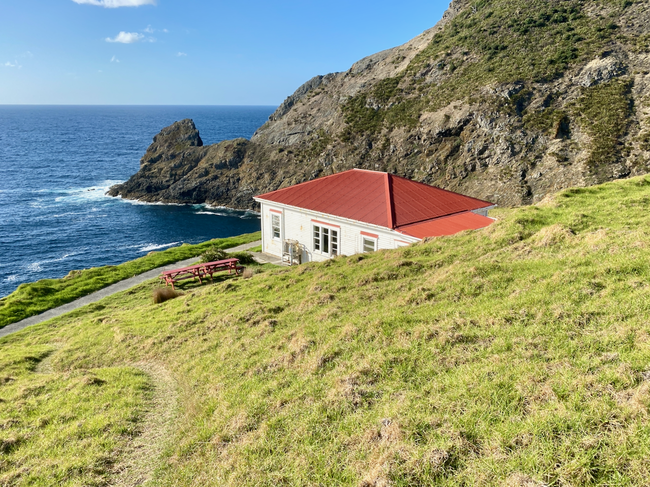 I climbed down to the old lighthouse, which is now redundant, replaced by the smaller (a tenth of its size), stronger, electric powered one on the other side. From that vantage point, I could for the first time see the old lighthouse keeper’s hut below, which has been converted into the Cape Brett Hut by the Department of Conservation. The rest of the walk is down the hill on long switchbacks, but after a long day walking, my legs are a bit like jelly.
