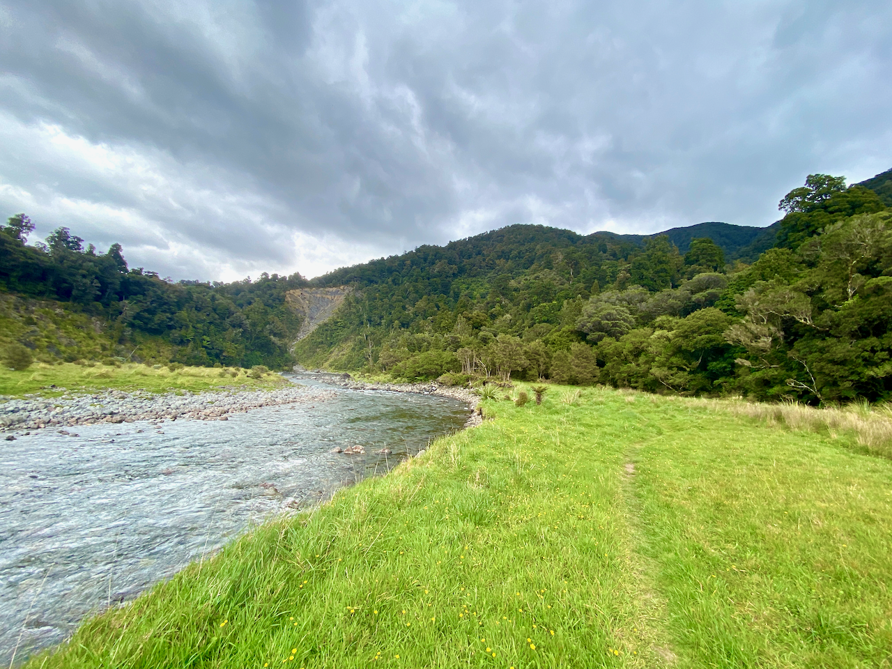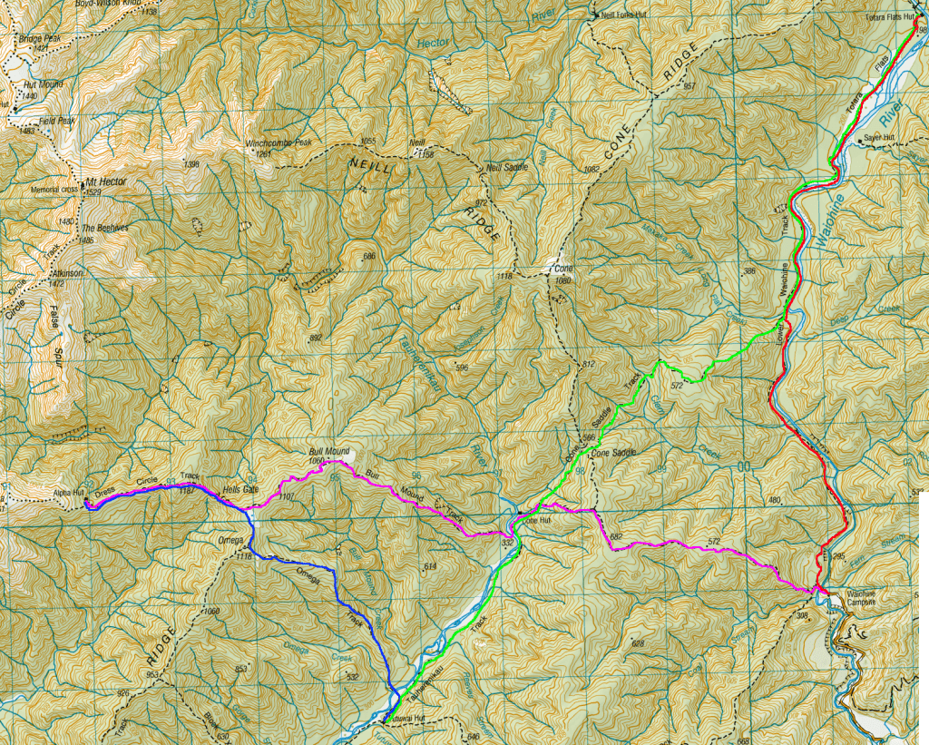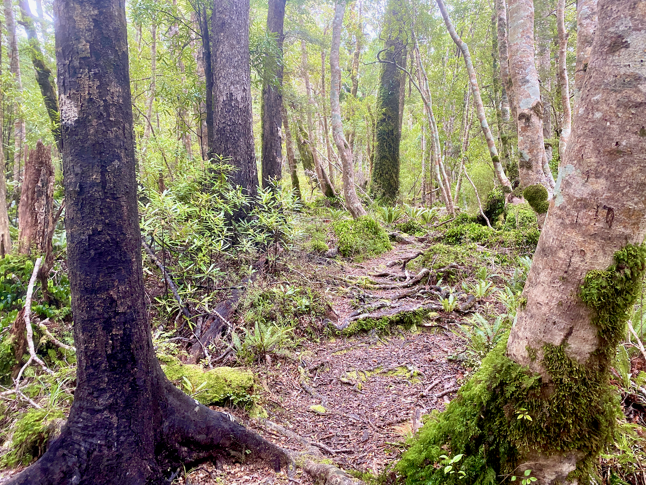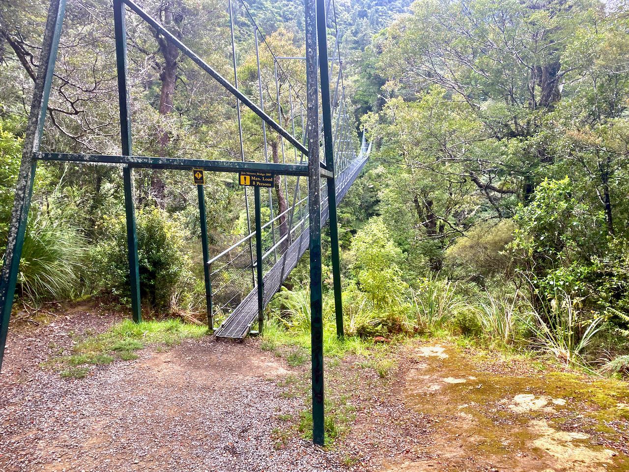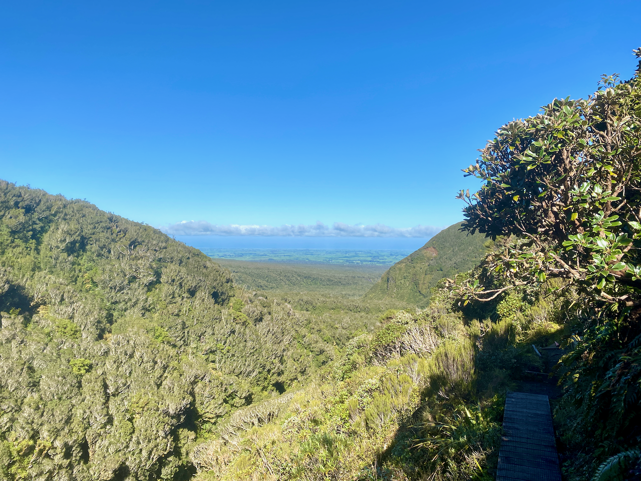 When I got down to the swamp itself, it was mostly tussock grass. I continued across it and over the Stony River on a footbridge – the river flows to the west where it cascades down Bells Falls. I climbed the hill on the far side on manicured wooden steps and a fair way up looked back to see the Ahukawakawa, the river, the mountain and the little green dot that was the Holly Hut at it’s base.