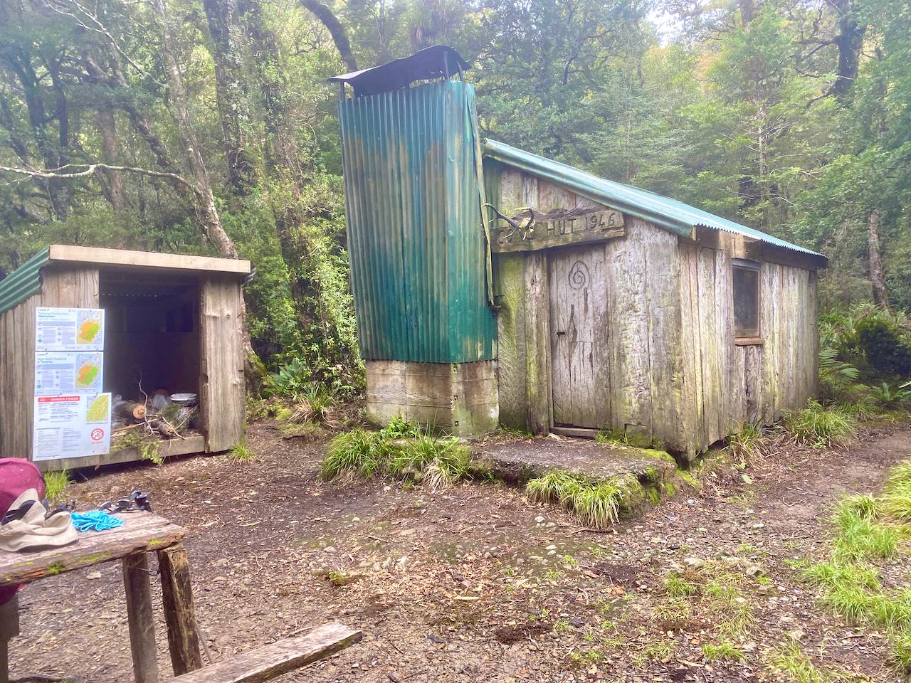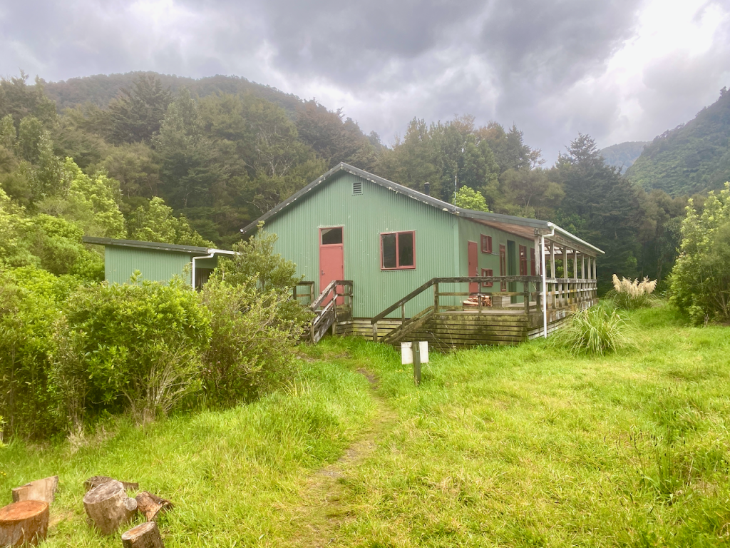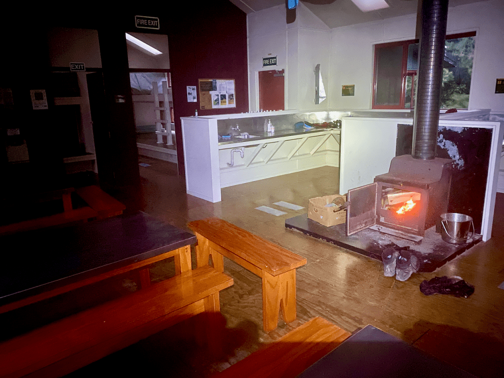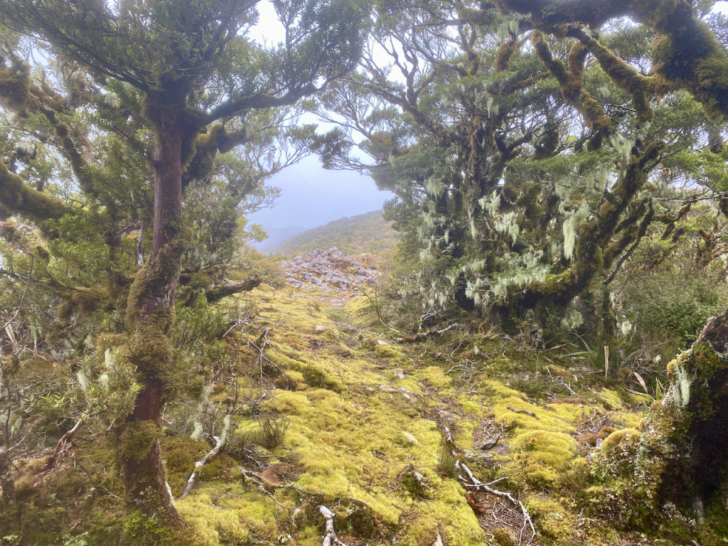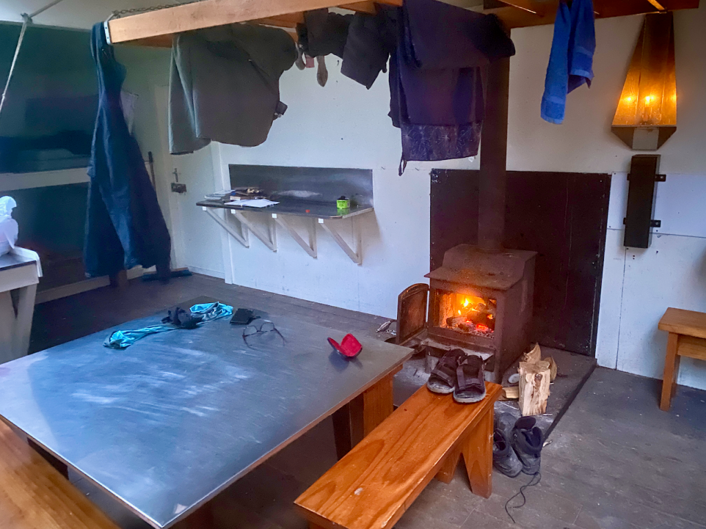 I climbed back along the trail back towards the hut. I had almost arrived when I heard a chopper overhead. When I came out at the hut, there were workmen there and the chopper that had delivered bags of firewood. They were also swapping out the shit crates – the large plastic crates the long drop toilets sit on that fill up with… well, shit, and toilet paper. I had to wait until they’d finished and flown away before I could continue.