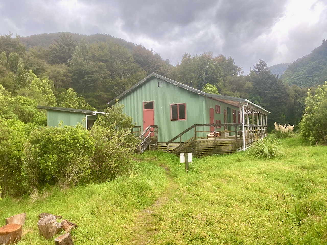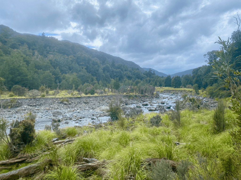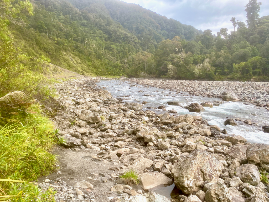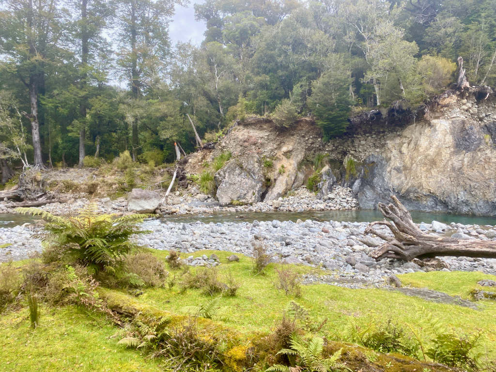 I climbed back along the trail back towards the hut. I had almost arrived when I heard a chopper overhead. When I came out at the hut, there were workmen there and the chopper that had delivered bags of firewood. They were also swapping out the shit crates – the large plastic crates the long drop toilets sit on that fill up with… well, shit, and toilet paper. I had to wait until they’d finished and flown away before I could continue.