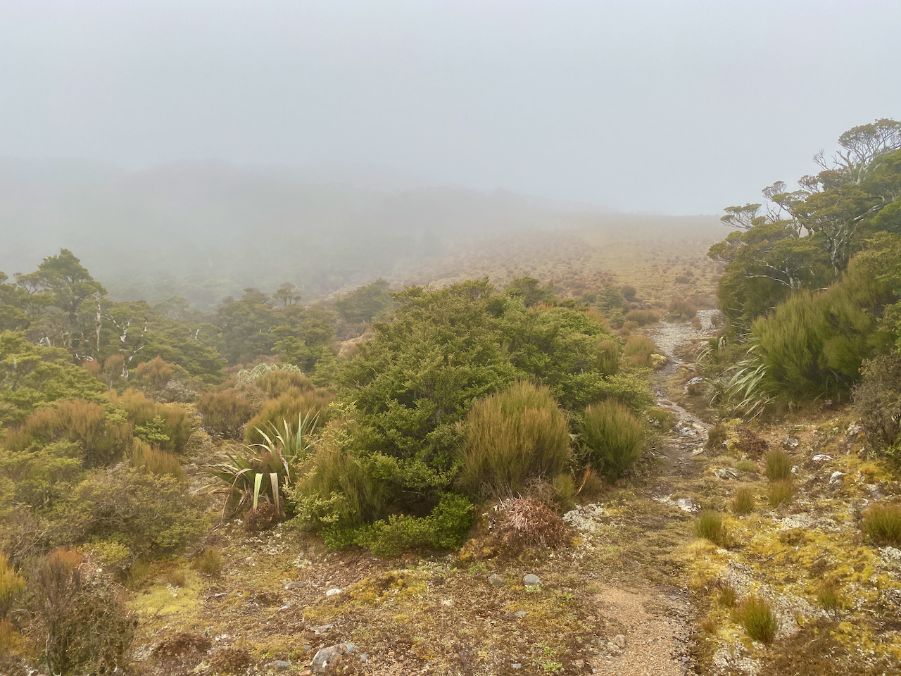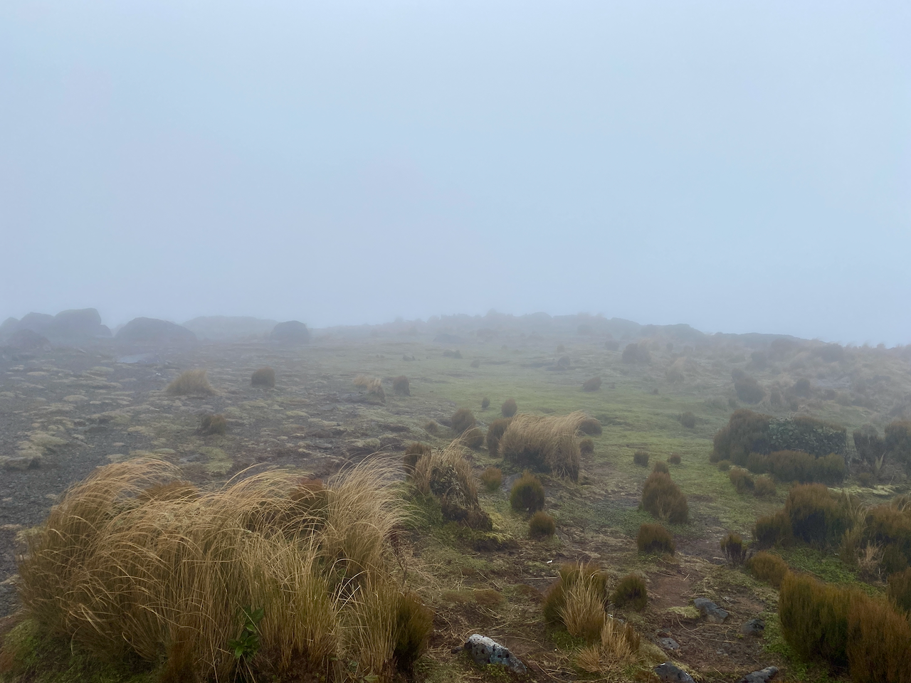 In the middle of the night, the wind picked up and the clouds swallowed us. When we awoke, visibility was at 20m or so. To finish the circuit, the three of us would have to climb over Henry Peak with the heavy wind gusts. I climbed up to the junction without my pack to check out the situation and found the winds rather strong.