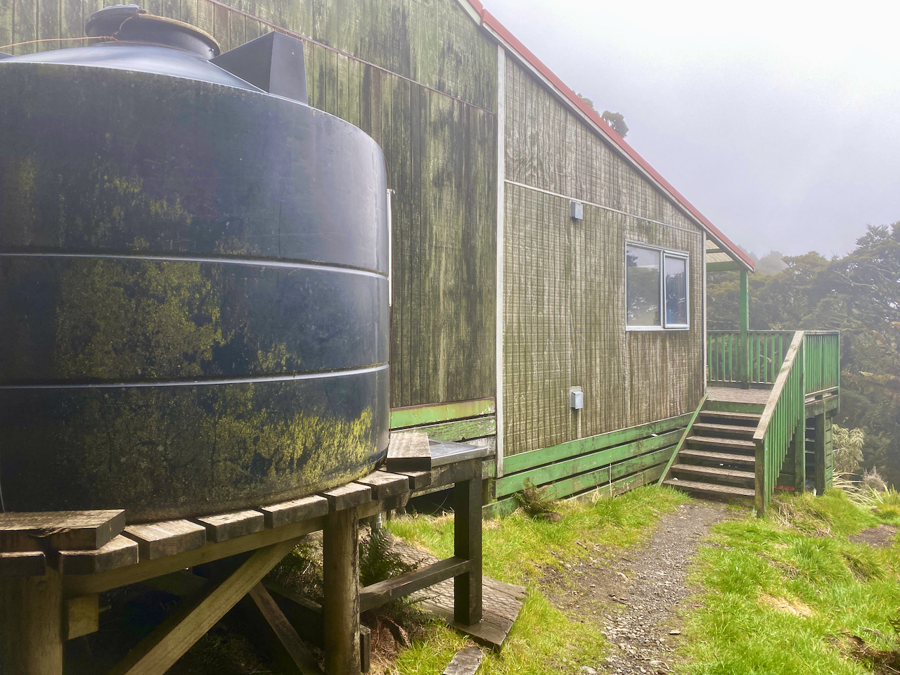 The muddy trail continued joining a boardwalk for the last hundred metres to the Holly Hut. In the hut were two other walkers, an American girl and a local guy. We chatted and drank Korean alcohol she’d brought with her from the Pouakai Hut the night before. Then when the hut lights came on – solar powered with a darkness sensor – we all retired to our separate sleeping rooms, of which there were three in the Hut.