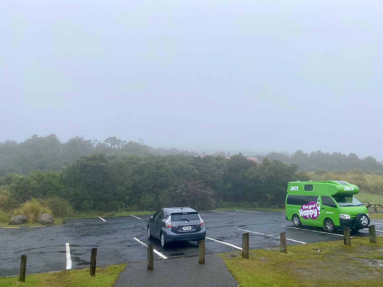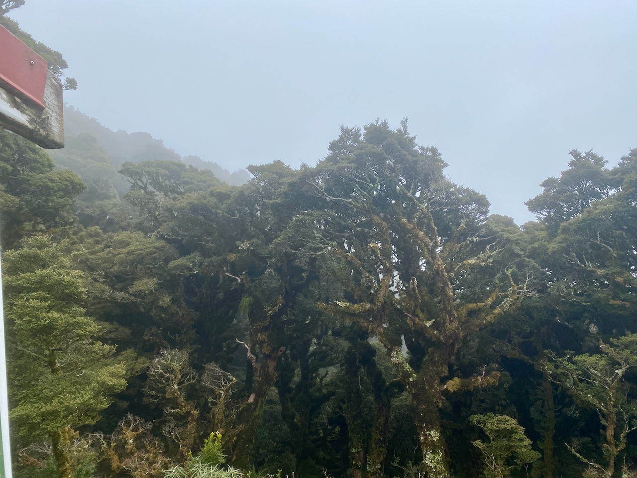 I stayed in a hostel in New Plymouth and on the morning of the hike, watched cloud cover the entire region. I couldn’t see the mountain from the city, but the weather was due to clear up. So, in the afternoon I headed out to the North Egmont Information Centre. Even as I approached the mountain, it was enveloped in clouds. I spoke to the lady at the information centre and watched the repeating weather forecast on their TV.