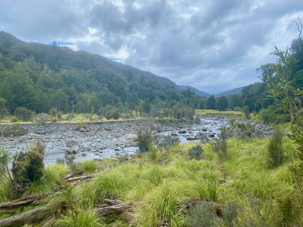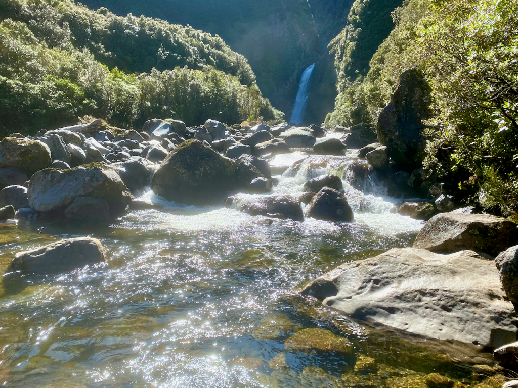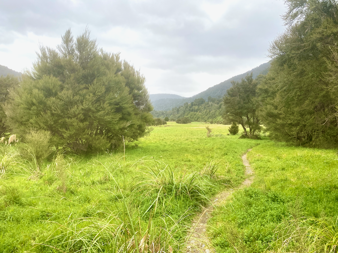 The sky was clear overnight and plentiful stars were out and it stayed that way into the morning. The local guy had left early, and the American girl and I ate breakfast and chatted. Then after she headed off, I walked the side trek down to Bells Falls behind the hut. As today’s walk is short – 2 hours – adding an extra hour would give me something to do. I headed out down a less defined track avoiding large puddles and pushing grasses aside to get through. I even got a good view out to the sea in the west.