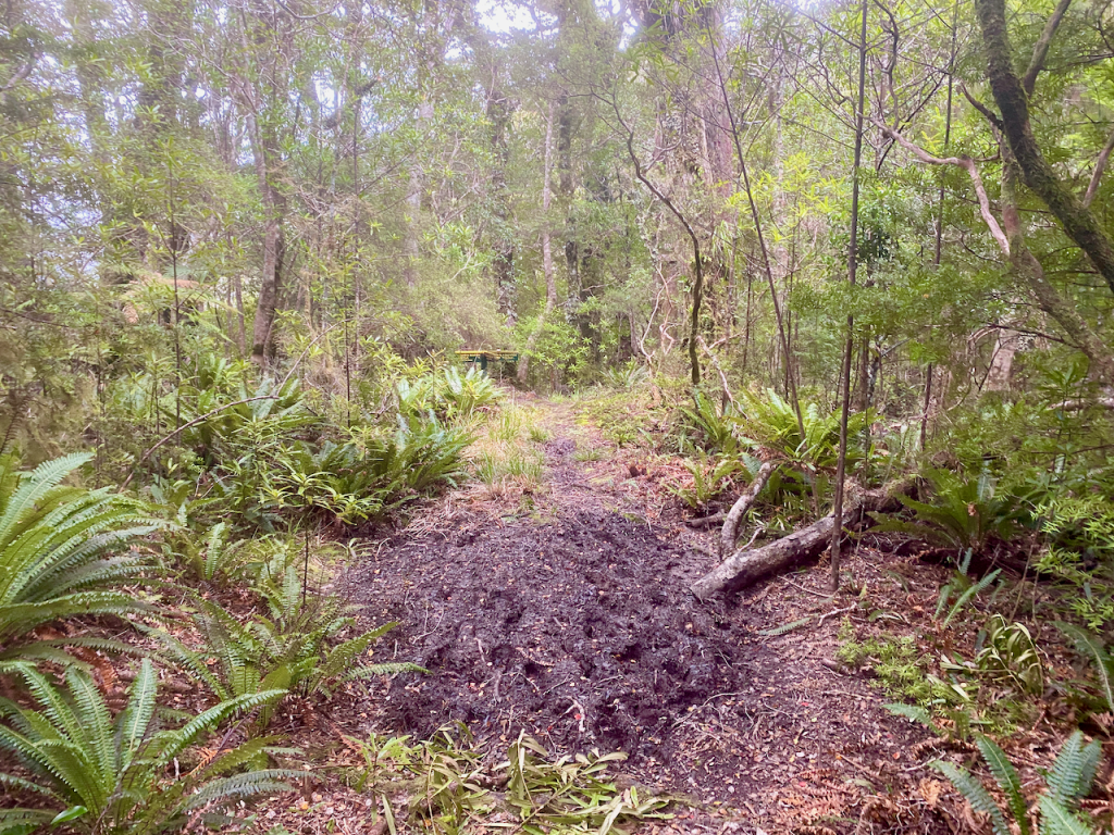 The main Holly Hut Trail was muddier with fewer of the wooden steps and more raw rock to climb over. However, beside the trail were pallet sized stacks of wrapped wood dropped off by chopper. It looked like they intend to lay a kind of boardwalk along the track, which would stop the mud and would also make it easier, not to mention more accommodating for tourists. I walked on and eventually came over a ridge to see the Ahukawakawa – the Sphagnum Moss Swamp – nestled in the crown of several lesser peaks.