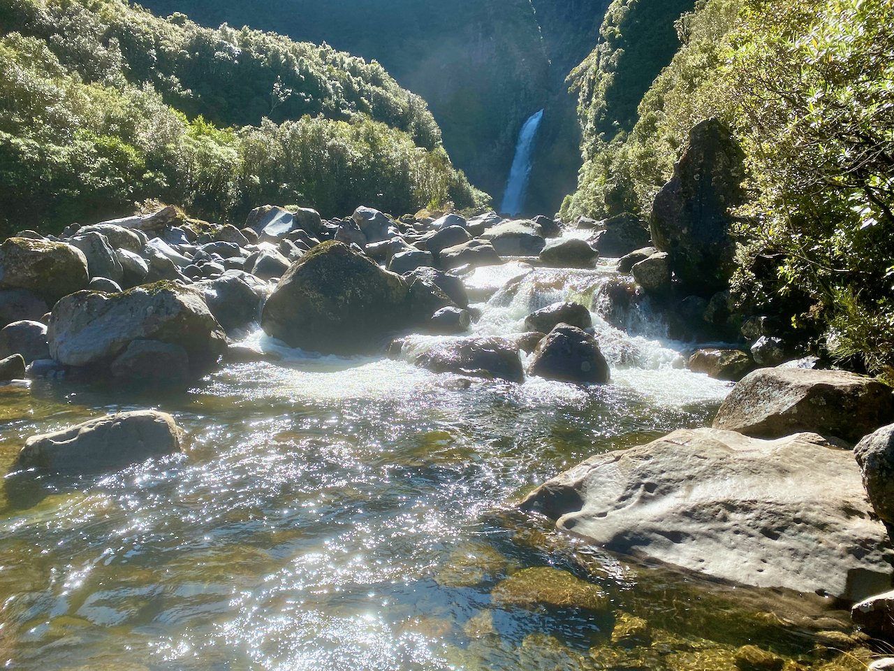 I followed the trail attached to the side of a large mound The Dome, dropping some two hundred metres in height until I came to the junction with the closed Around the Mountain trail. Five minutes later and I was rock hopping across the side of the river to see Bells Falls.