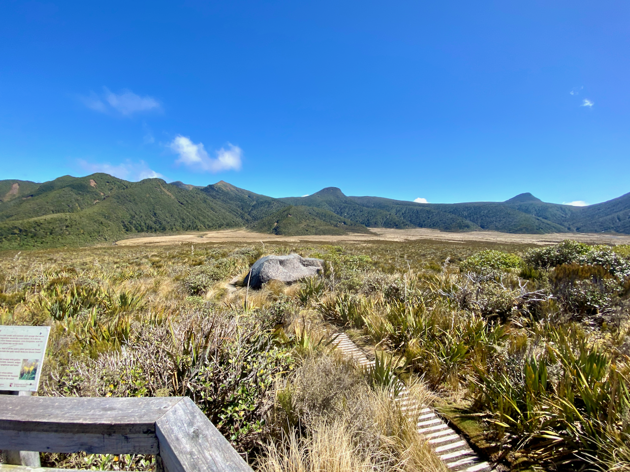 I donned my pack and headed off just as two ladies with day packs arrived. I walked the 10 minutes back to the junction and took the route downhill towards the Ahukawakawa swamp. The trail is a wooden boardwalk all the way, and half way down I met a girl sitting in an information booth. We chatted before I continued on.
