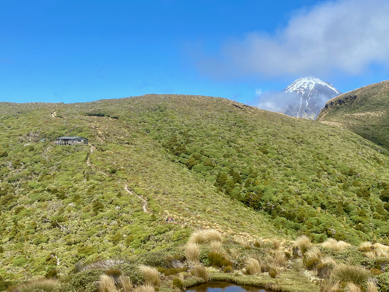 I pushed on, getting to the top of the ridge and around to a nice rocky outcrop beside the trail where I stopped for lunch. After eating, I continued on behind a large mound poetically named Hump. On the other side, I came to a rocky area with the trail heading down. I followed it for several minutes before arriving at the hut. I chose a bed and dropped my pack. Many groups of day walkers were coming up from the Mangorei Track. They would come across the deck to use the toilets, or go inside and have lunch on the tables. Across from the hut is another mound, this one unnamed. I chose to climb it to get away from the daywalkers and sat looking back at the Pouakai Hut.