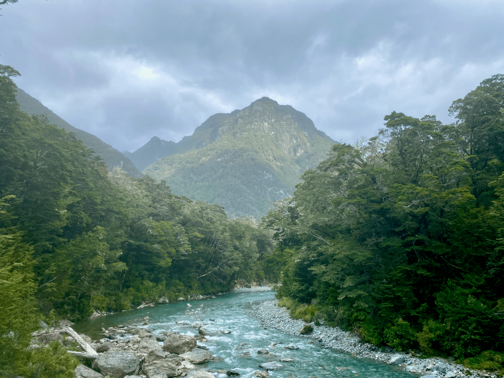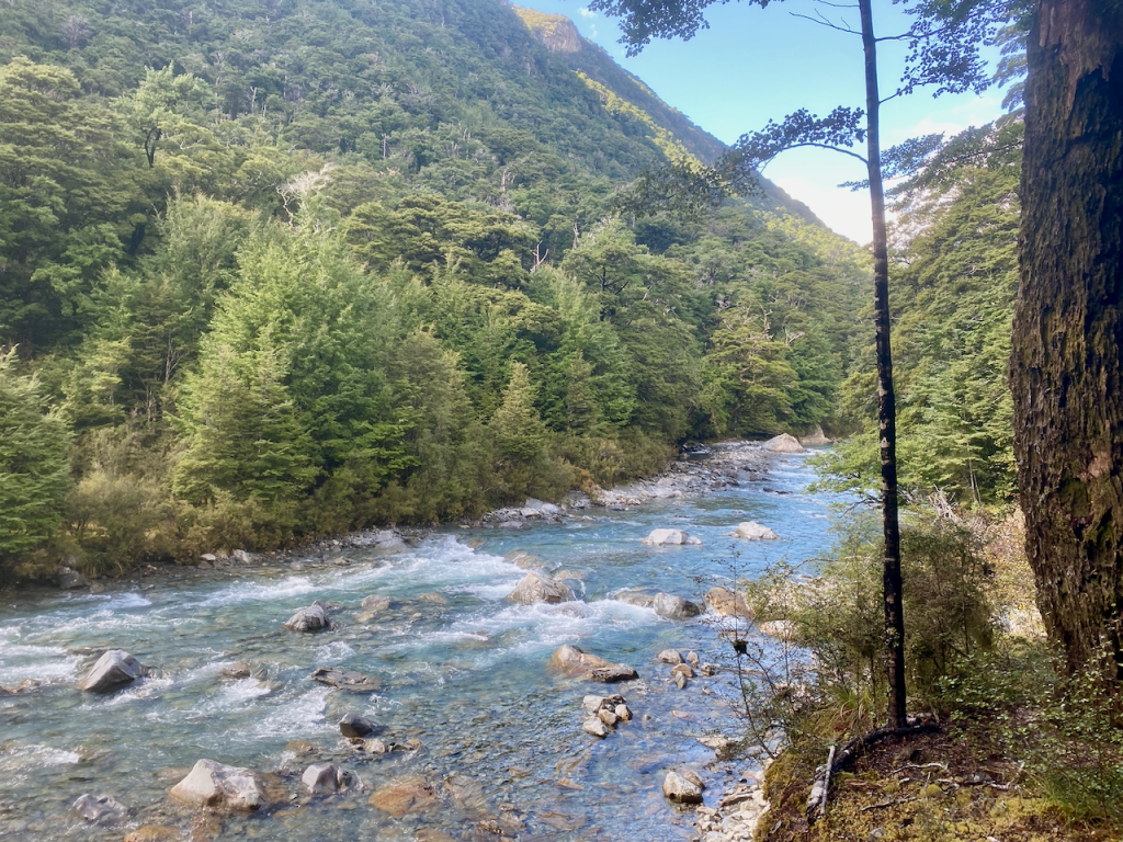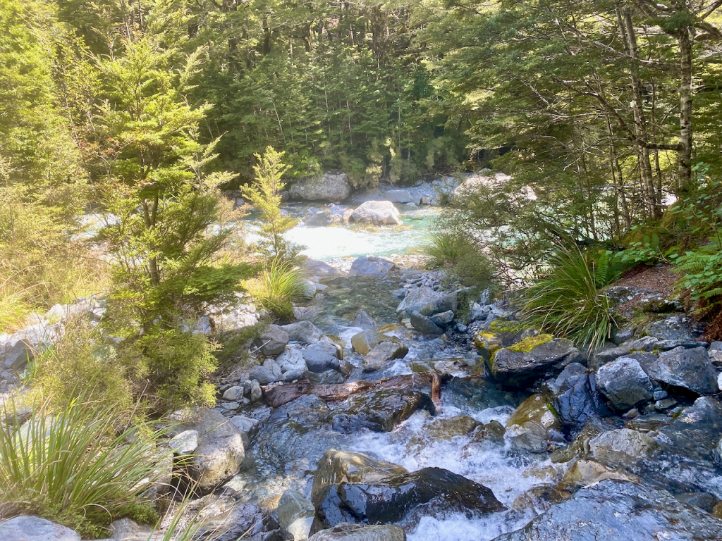 Having spent the night in nearby Queenstown, I caught a trail transport to the trailhead at the Routeburn Shelter where several of us were dropped off. I left the shelter feeling icy at just after midday, marching into the forest and following Route Burn. A burn is a watercourse, somewhere between a large stream and a small river.