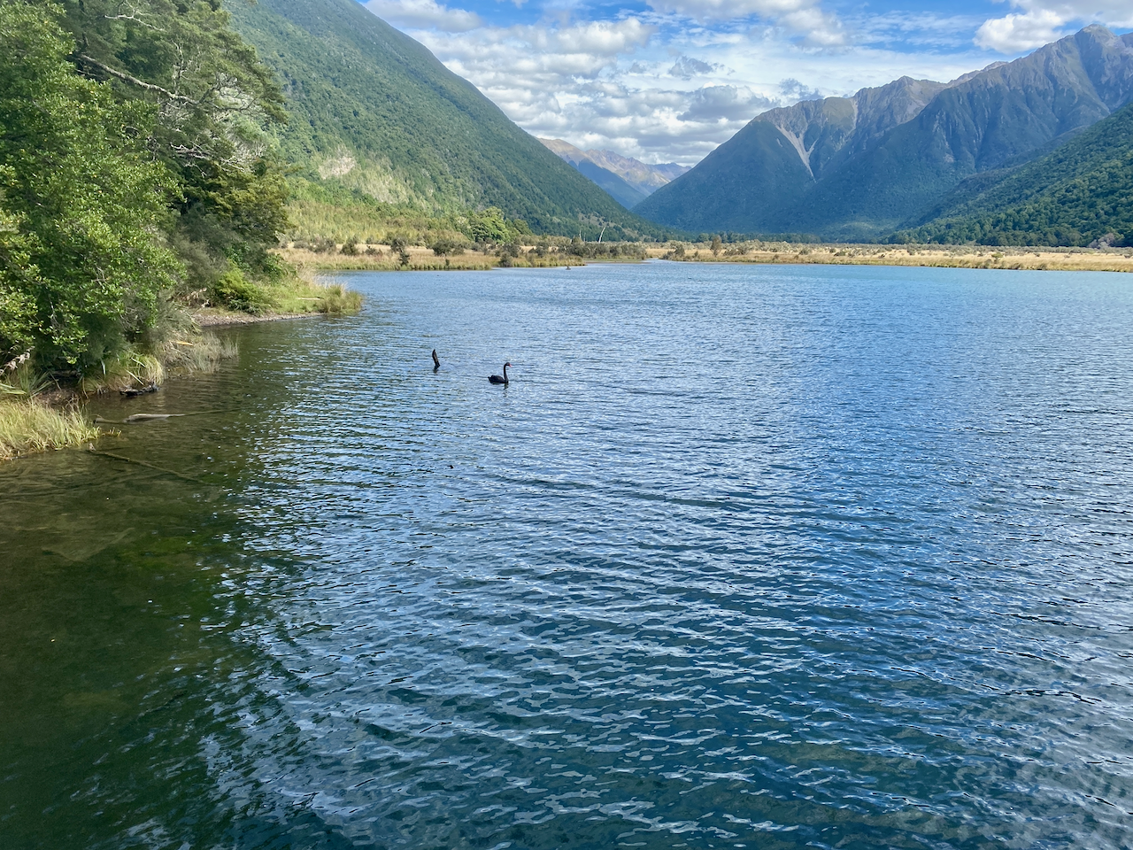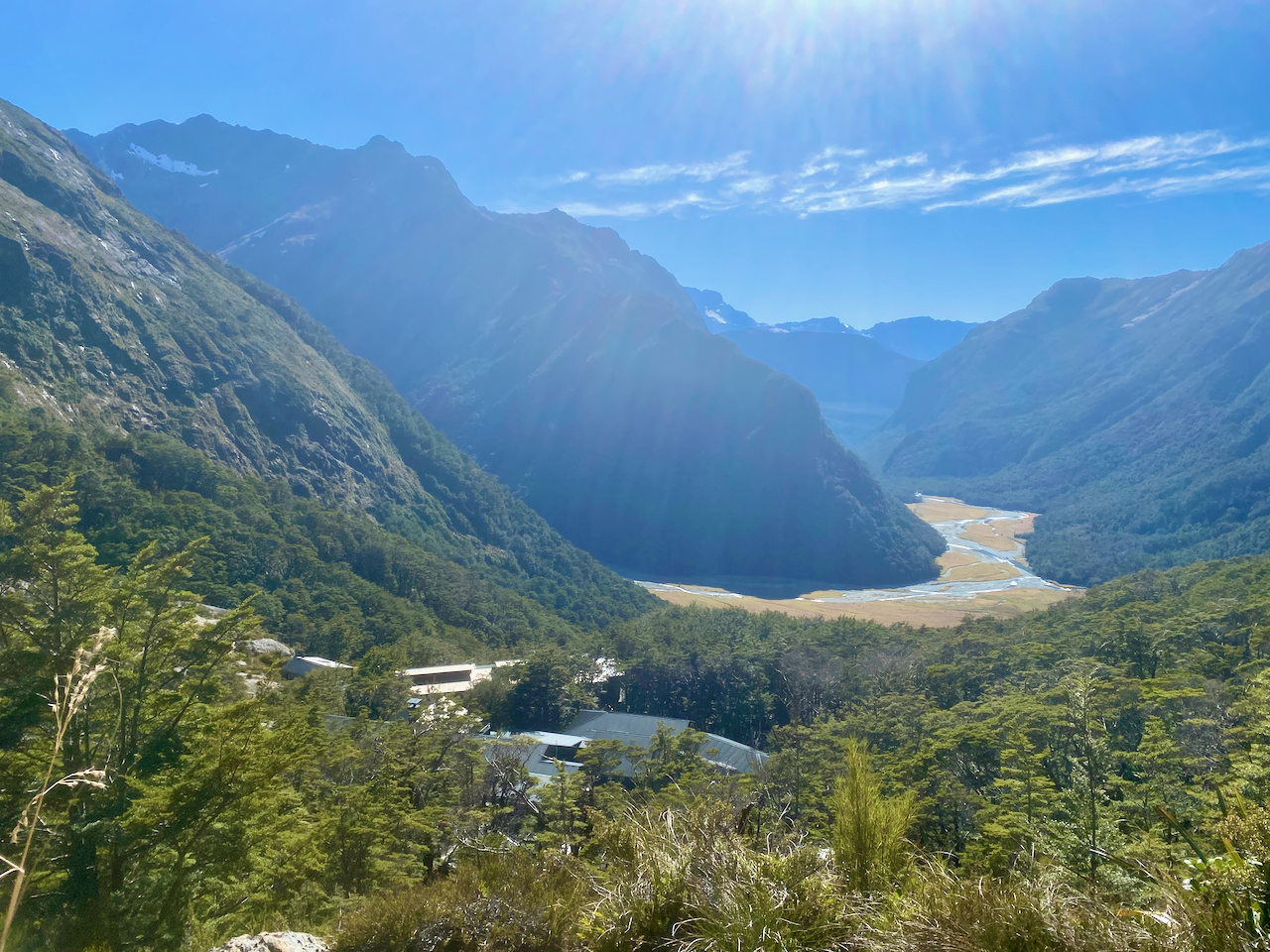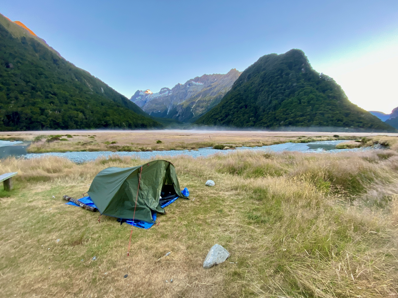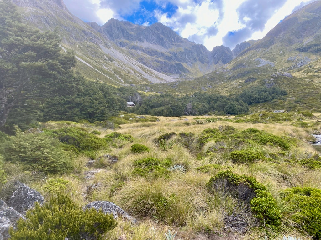 The trail itself could be described as the motorway of hiking trails, wide, flat and stony. This was purposeful, I assume, to make the hike accessible to beginning hikers. Before long, I could see the flats opening up on one side of the river and came to the Routeburn Flats Hut. Only 200m to the campsite and I was out of the trees, where I pitched my tent and hung out for the afternoon.