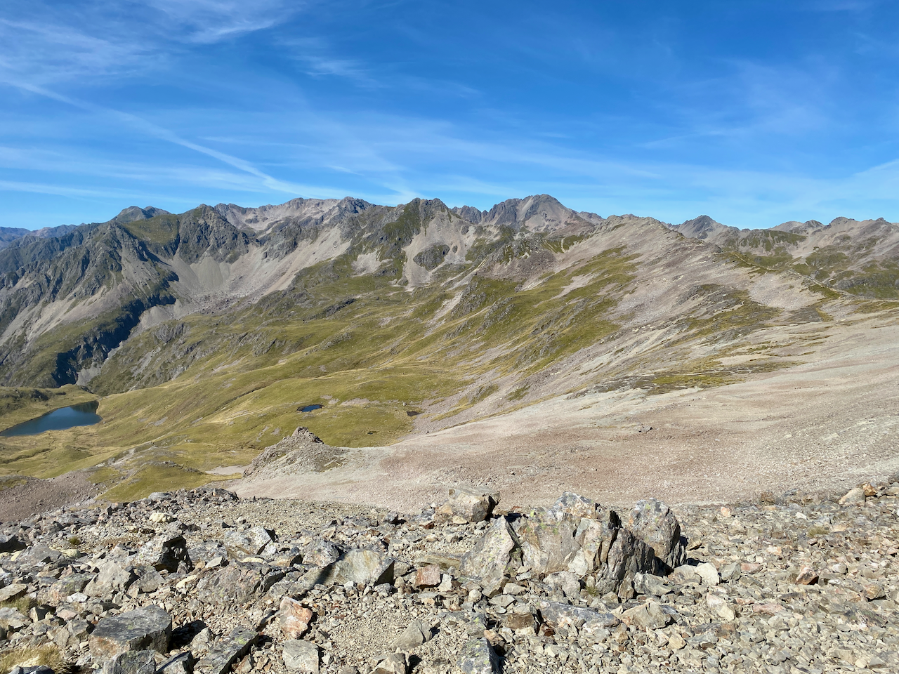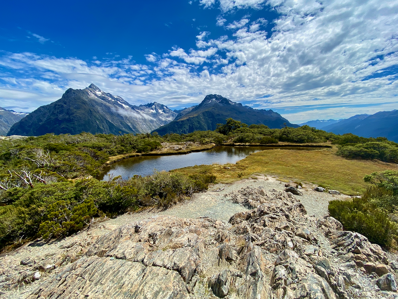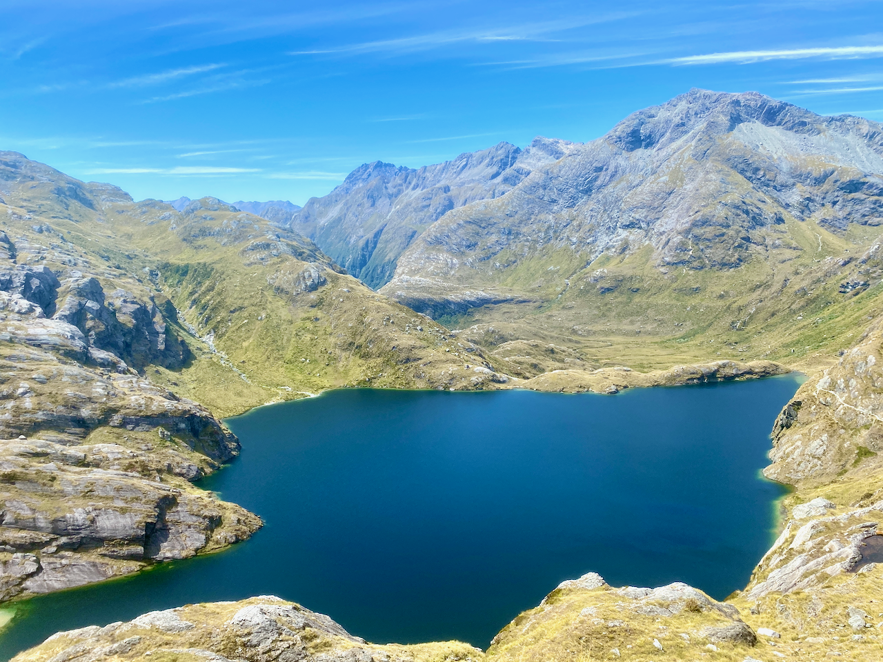 While there was a defined path, there was some rock hopping and thin somewhat precarious paths, but I always walk with caution on these paths. I got past and rounded the ridge line to look down onto the valley where Lake Angelus was supposed to be, but there was another smaller ridge in the way. Below me I could see the Hinapouri tarns instead.