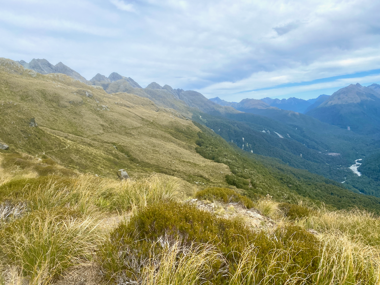 At the other end of the valley I could see a lake, but with so many lakes in Fiordland, I couldn’t tell which it was. I hung about for 10 minutes before heading down. As I got to the shelter, I discovered I was out of water with 3-4 hours of today’s walking still to go. I stopped for a few minutes before heading off south along the upper slopes of the Hollyford River Valley.