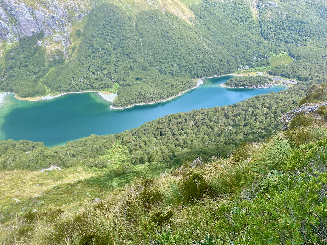 I continued and eventually rounded a peak to see Lake Mackenzie below, the hut (the white block on the right), and the camp (near the largest of the visible beaches. After rounding the peak, it was all downhill to the lake.