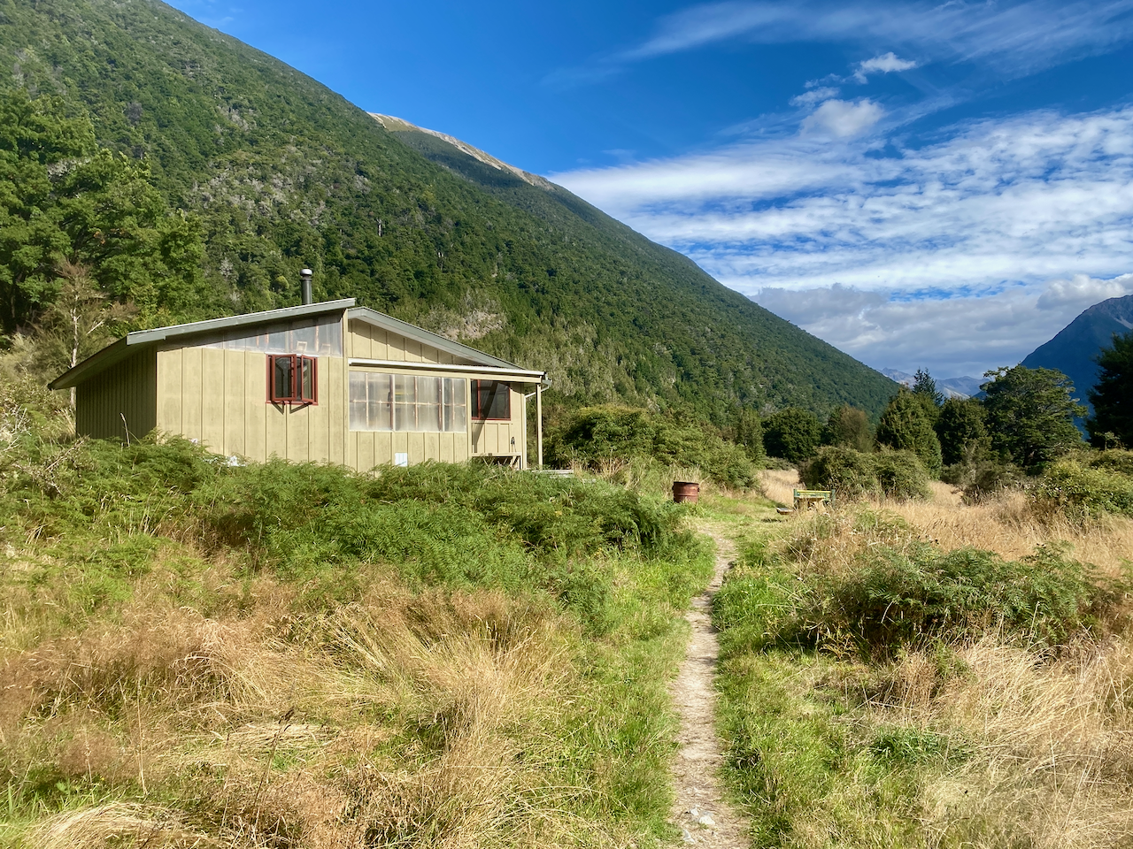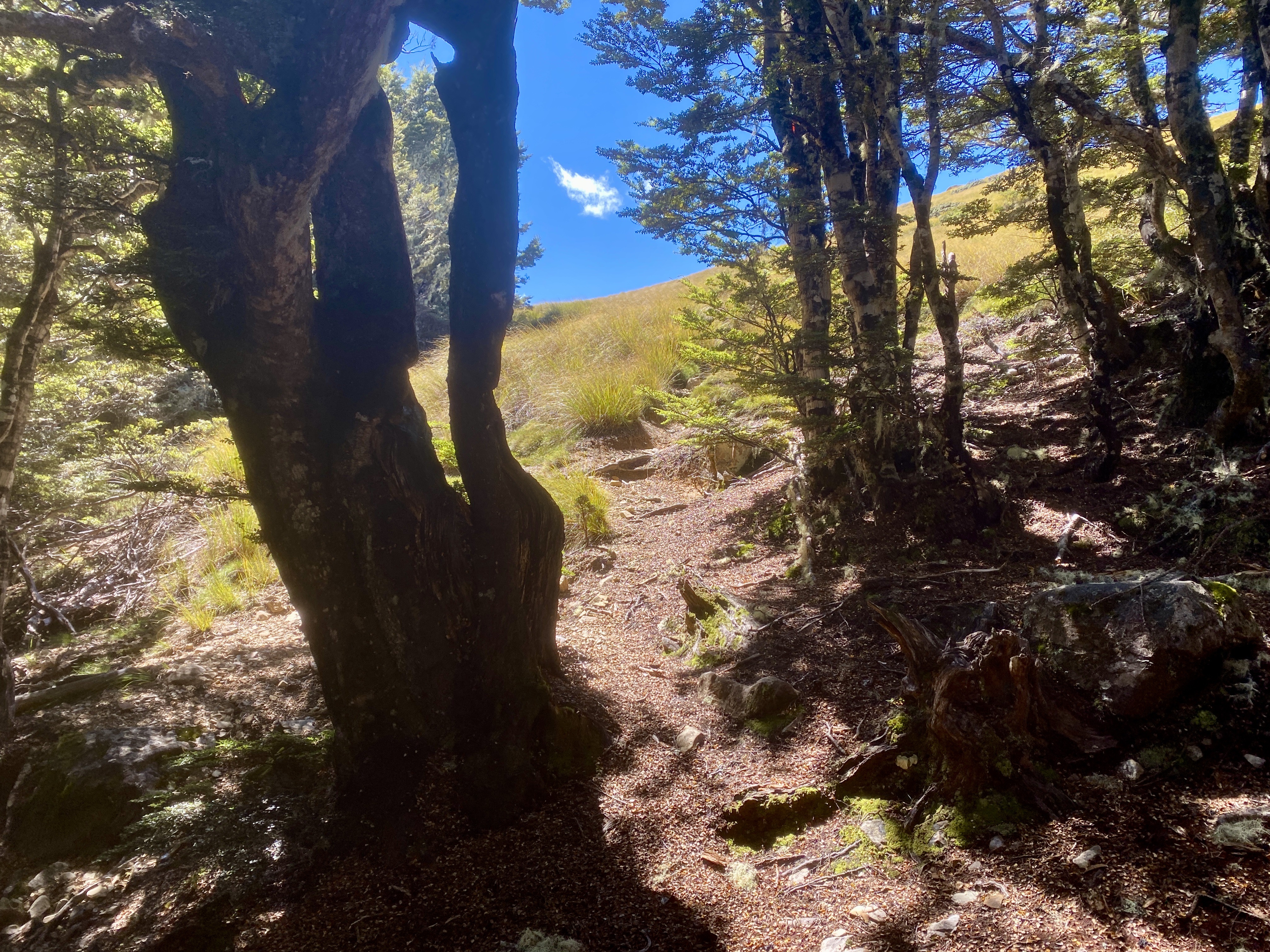 I continued on, climbing another 100m over a longer distance before the trail headed down, to come out at Cone Hut built in 1946. I stopped here for lunch. I also noted that a previous walker had marked in the hut logbook that they had left a small bag in the Alpha Hut. I would keep an eye out for it.