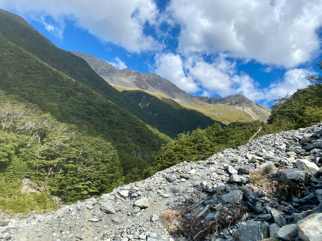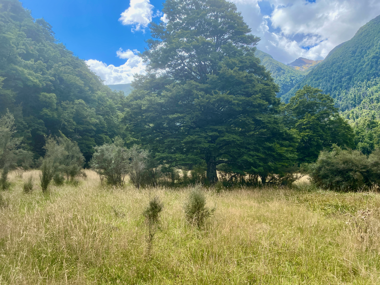 Perhaps I should have climbed the extra 500m to top of Cone peak and followed the ridge down, but I chose the easy path and headed down towards the Waiohone river. I crossed a small plateau and stopped for some lunch before continuing down to the river.