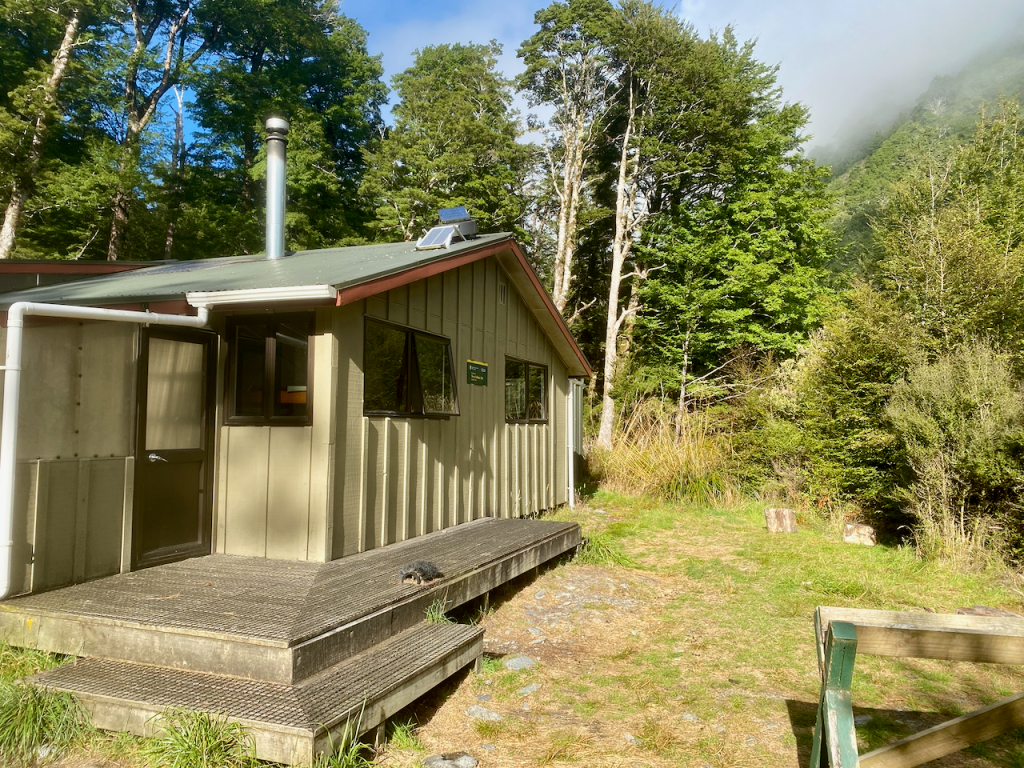 On the other side, I climbed to nearly 1200m, thankfully leaving the wind behind, but my breath was coming icy and temperatures had dropped. I descended to below 1100 before climbing again. The topographic map I was following on my phone didn’t have my hut on it, so I assumed to was near the summit of Alpha, still 200-300 metres higher than I was. But not long after, I came out of the trees to find the hut.