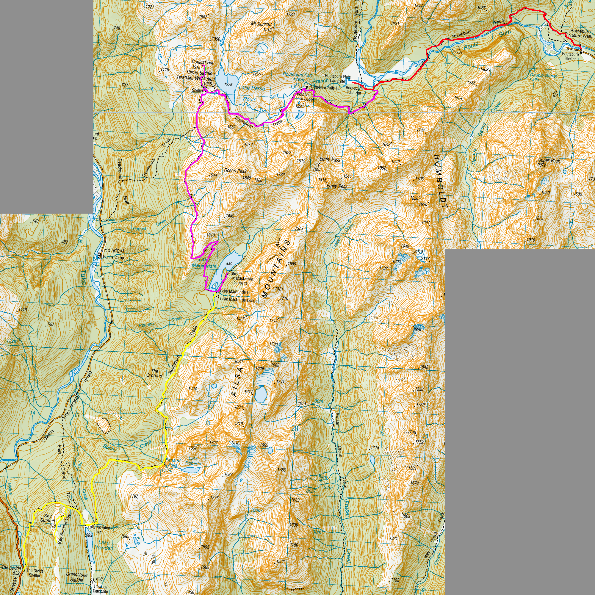 As the path led around above the lake, I crossed the hike’s highest point (not including side trails) at just under 1300m, and rounded the peak to see the Harris Saddle Shelter. I crossed the saddle and set my pack down for lunch.