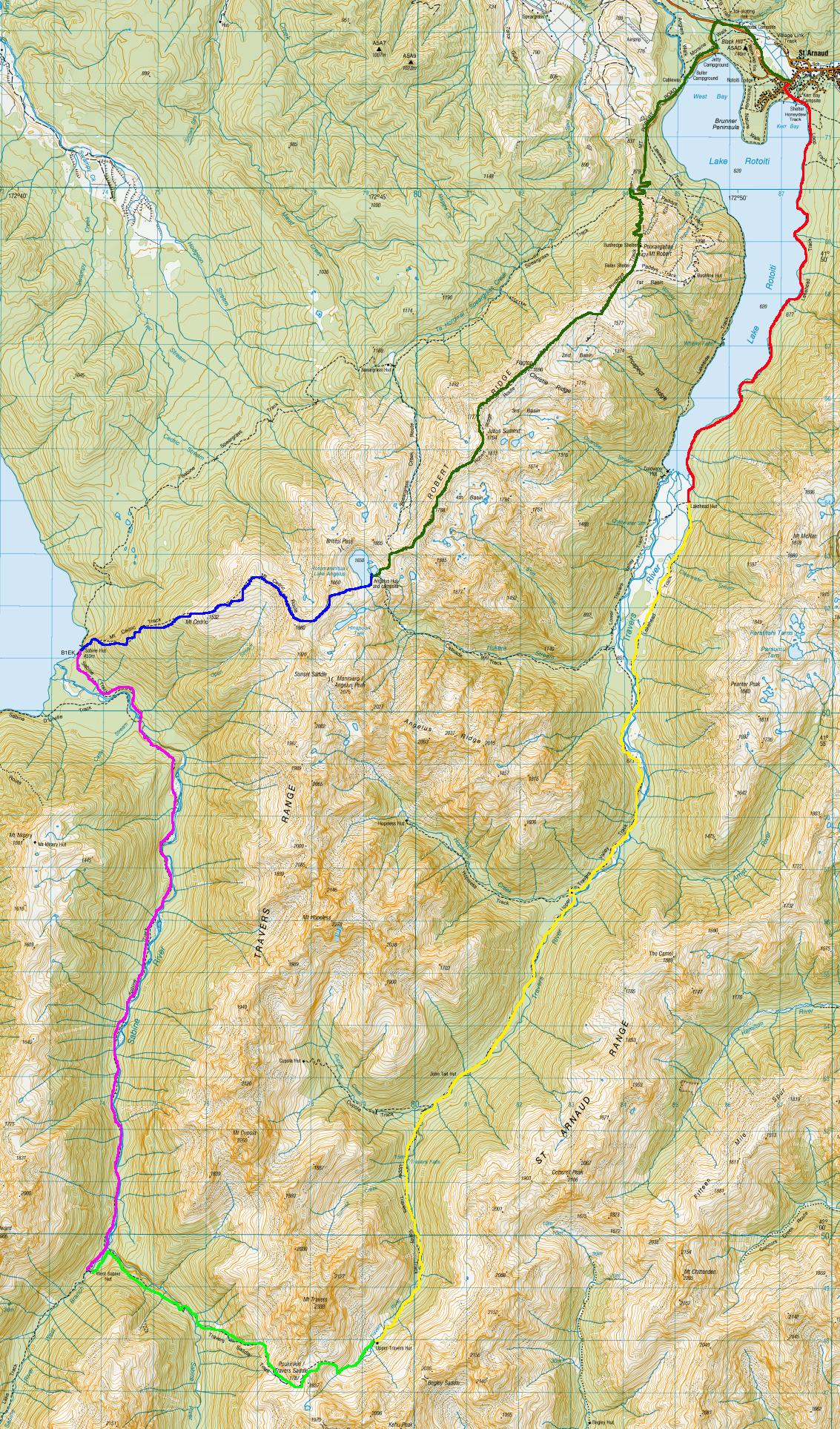 Overall, I should have taken more care in selecting a hike, as I found this circuit to be particularly frustrating. If I had walked the entire length as planned, but added the side trip to Blue Lake, it would have been six days in the forest, with only 2 hours in the alpine region crossing the Travers Sabine saddle. As I particularly dislike walking in the forest for anything longer than a day, I was thankful for the girl I walked partially with on day 2 and her suggestion to go to Lake Angelus instead. As these are my first long hikes in the NZ mountains, I will be more careful with my planning in the future.